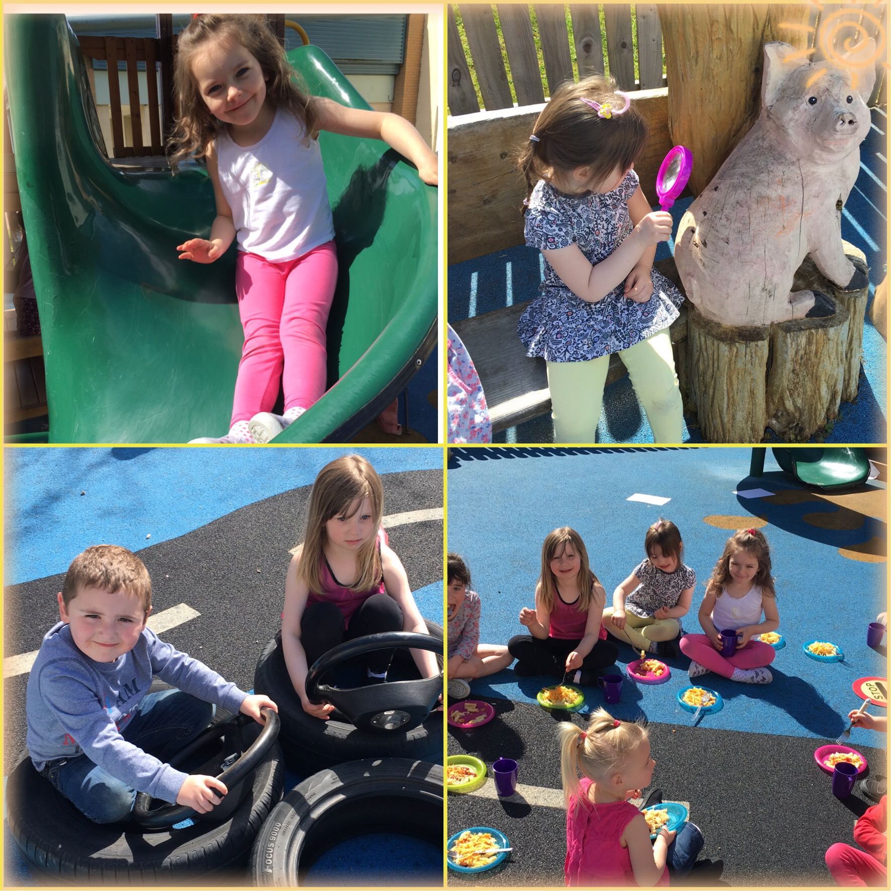 We took all our resources outside for the day and the children enjoyed exploring with magnifying glasses, drawing the flowers and playing with our new steering wheels.
