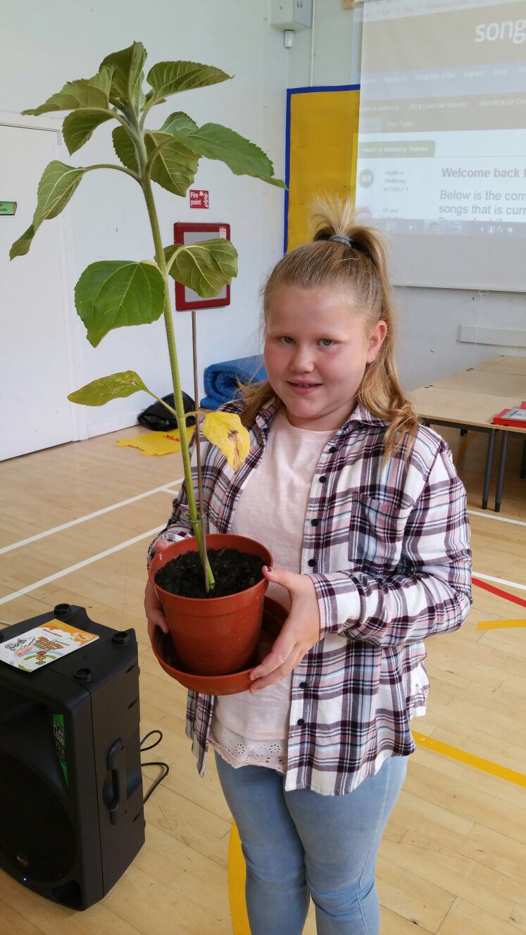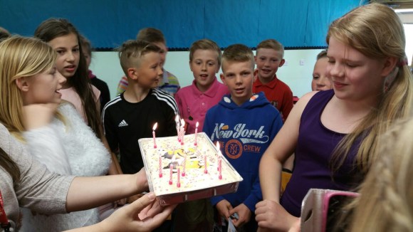 Friday was a busy final day of term! Amy celebrated her 12th Birthday and shared some delicious cake, Ellie won the sunflower competition and Miss Taylor gave the school a lovely new football all the way from Northern Ireland.