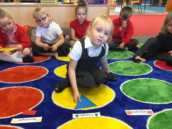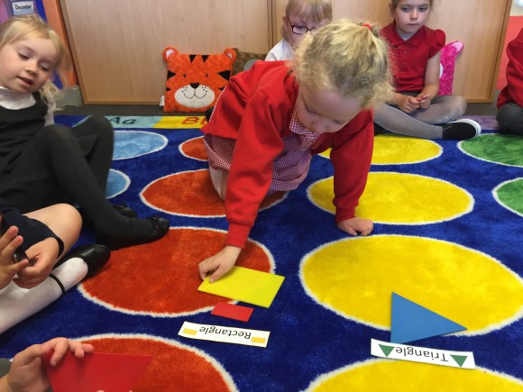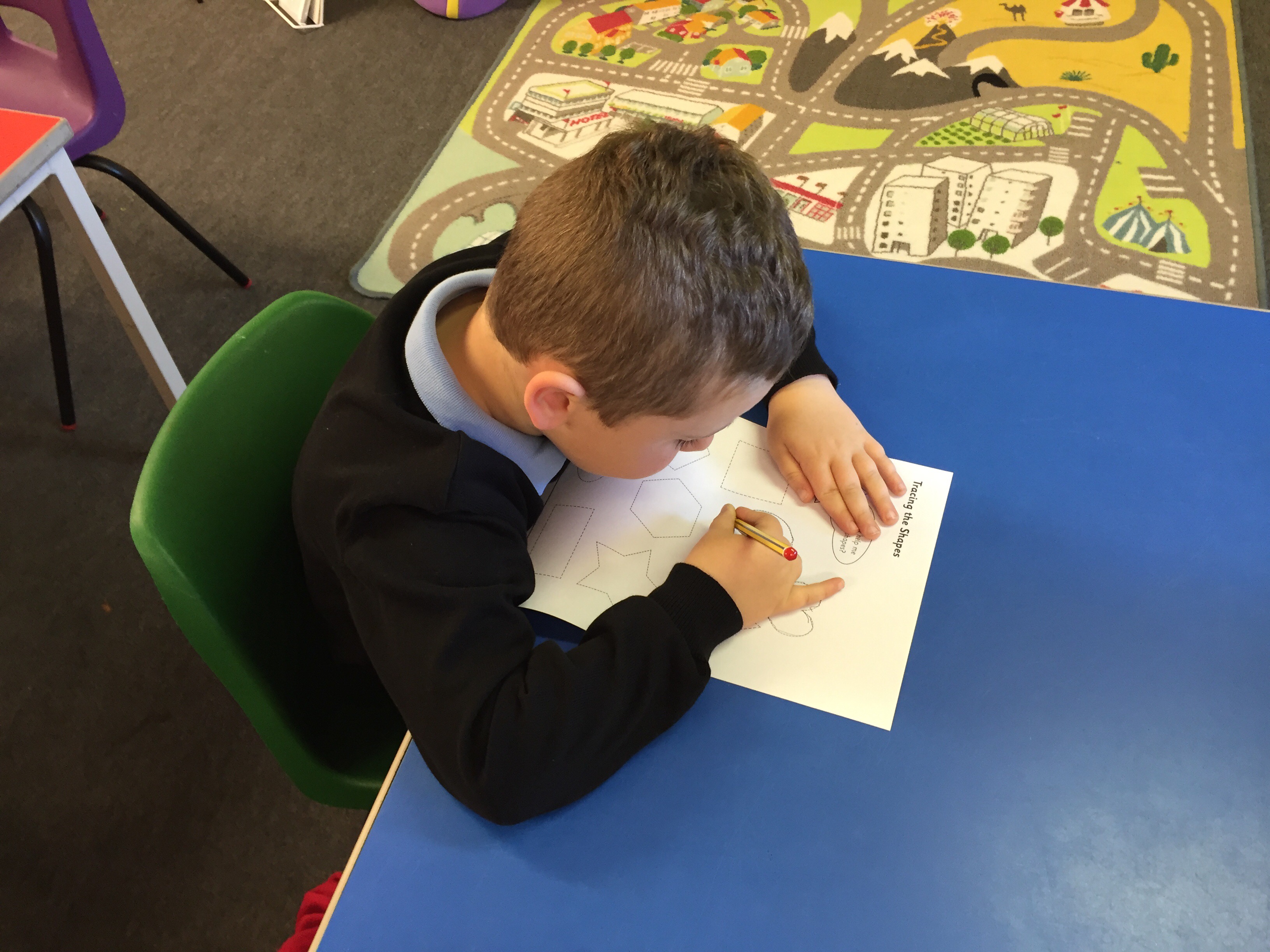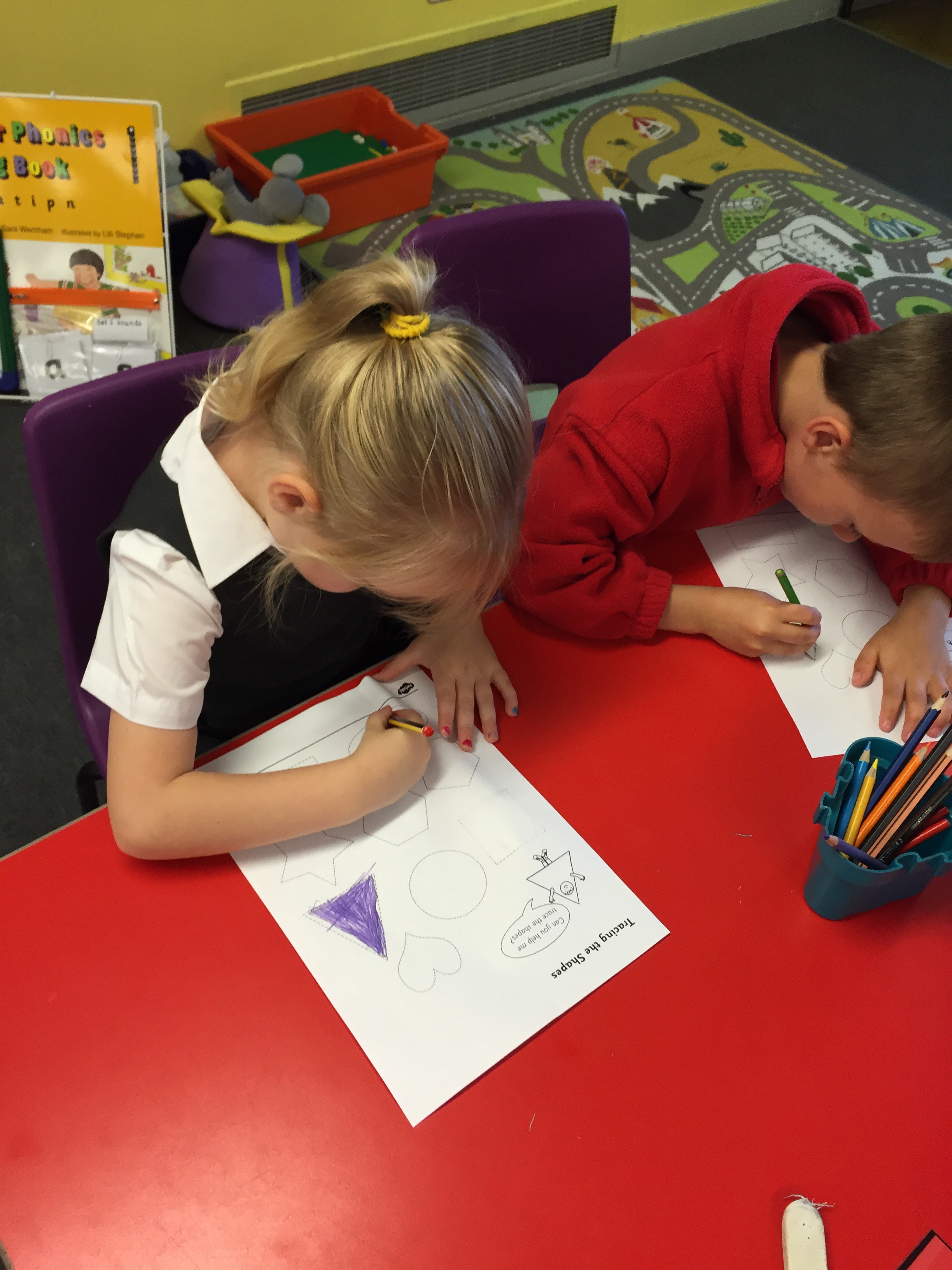We also looked at some 2D shapes this morning. The children identified circles, rectangles, squares and triangles very well this morning and also learned about pentagons and hexagons. Khalea also managed to tell us all about an oval- well done. We sorted and traced some shapes today too- look at us busy at work.