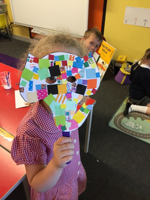 Look at our finished Elmer masks! I’m sure you’ll agree they look absolutely fantastic. The children made a super job Collaging the squares to make a patchwork effect.