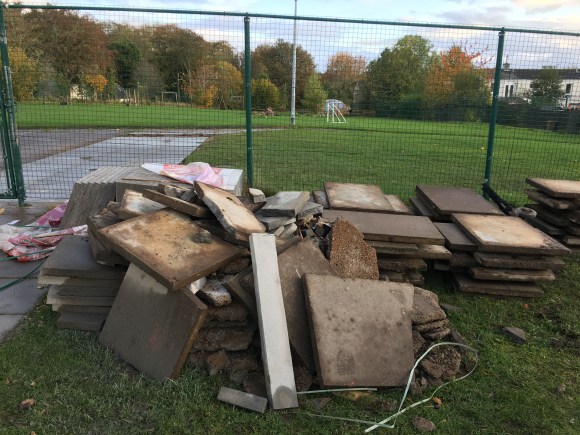 Most of the old slabs and rubble by the side gate was to be removed this afternoon. The work will be on-going over the next couple of days, please take care.
