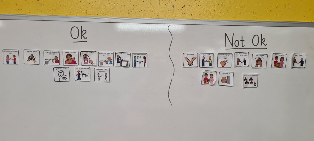 To help the children understand what is ‘Ok and Not Ok’ in relation to Covid when we are in school, the teachers have been using the following visuals to help them remember and refer to.