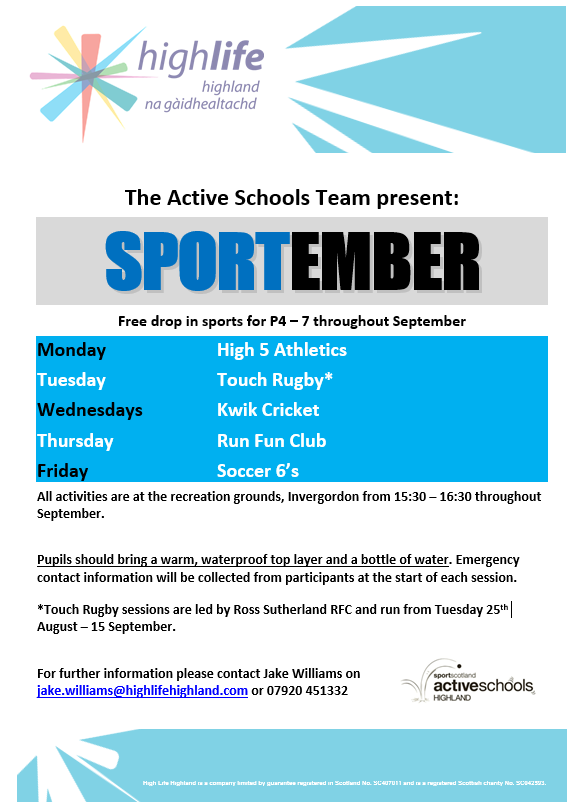 Free sports throughout September for P4 – 7 at ‘the rec’ – starts Monday 31st August 15:30 – 16:30