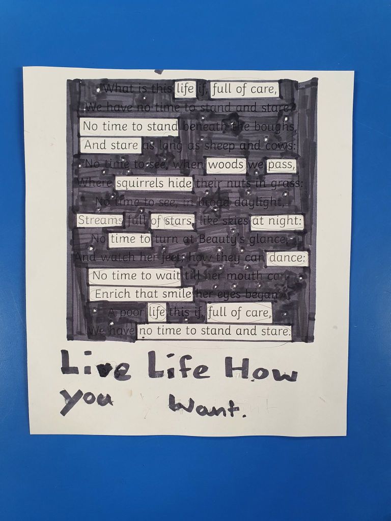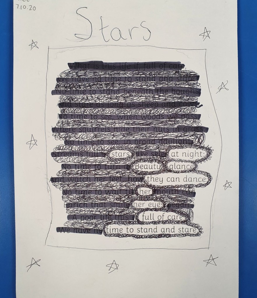 We had a lovely morning in P5/6/7 yesterday with a literacy session looking at blackout poetry. We took pieces of text from other people and step by step we worked together to create our own masterpieces. We started by looking for a key word and then we took words that we thought might make a nice poem together. After checking it all made sense, followed a theme and flowed nicely, we got to the fun part of blacking out the rest of the text. It is a lovely activity to play with the meaning of language and to aid writer’s block, we’ve all had it!