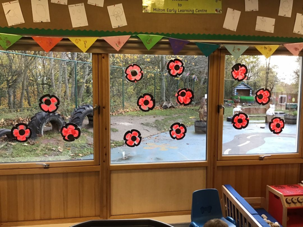 We made beautiful poppies to remember those who went to the wars. Using sticky plastic, tissue paper and card we created poppies for our windows. We think they look great.