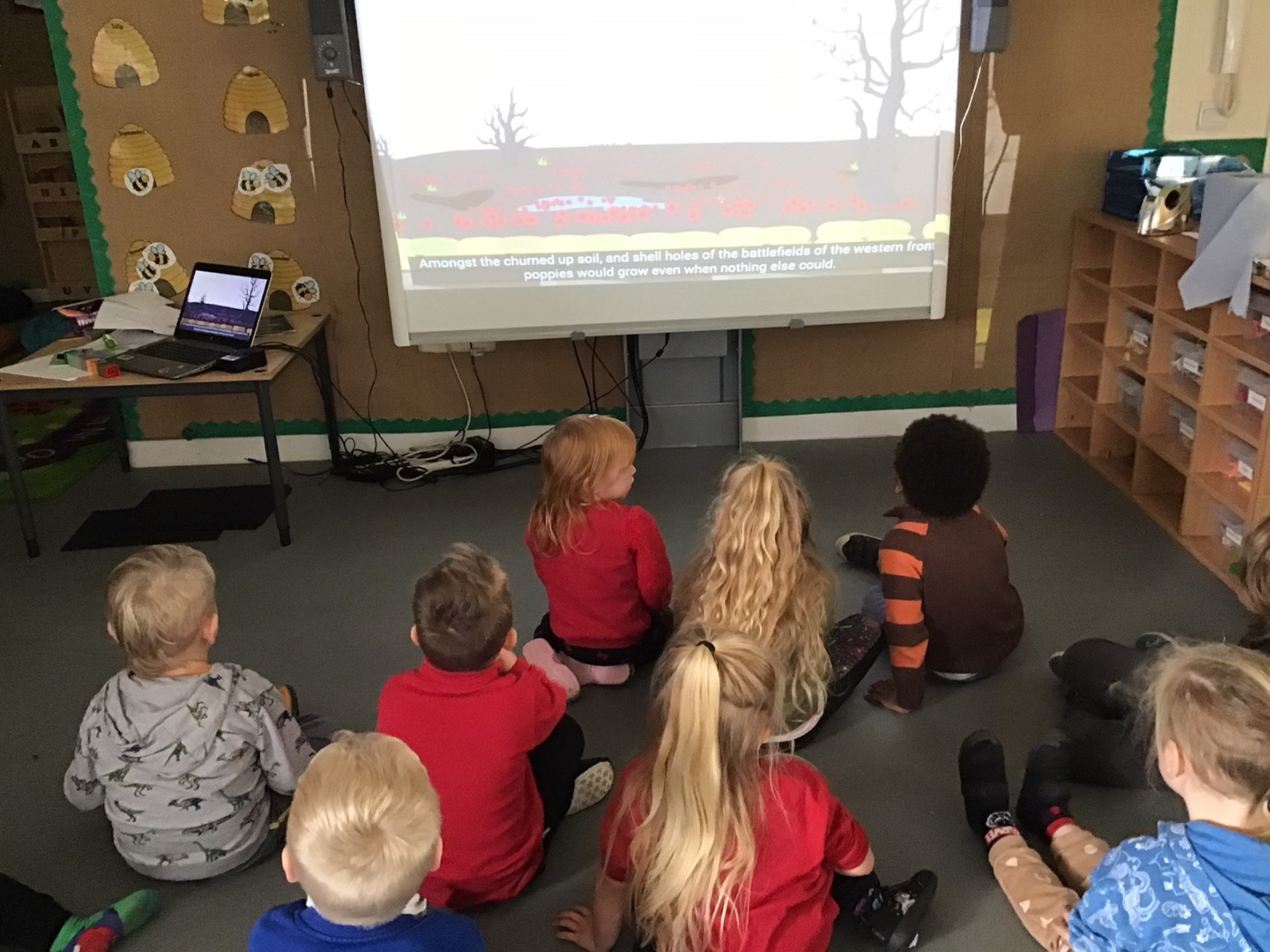 Today we learned about why we wear poppies. We watched some short films about poppies and learned we wear them to remember all those who went to war for us. We then made a giant Poppy wreath together to go our wall. Some children drew pictures of soldiers who fought in the war.