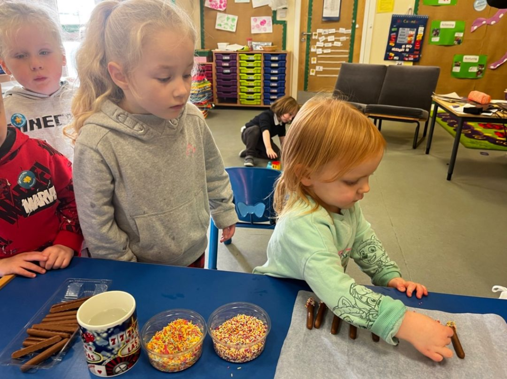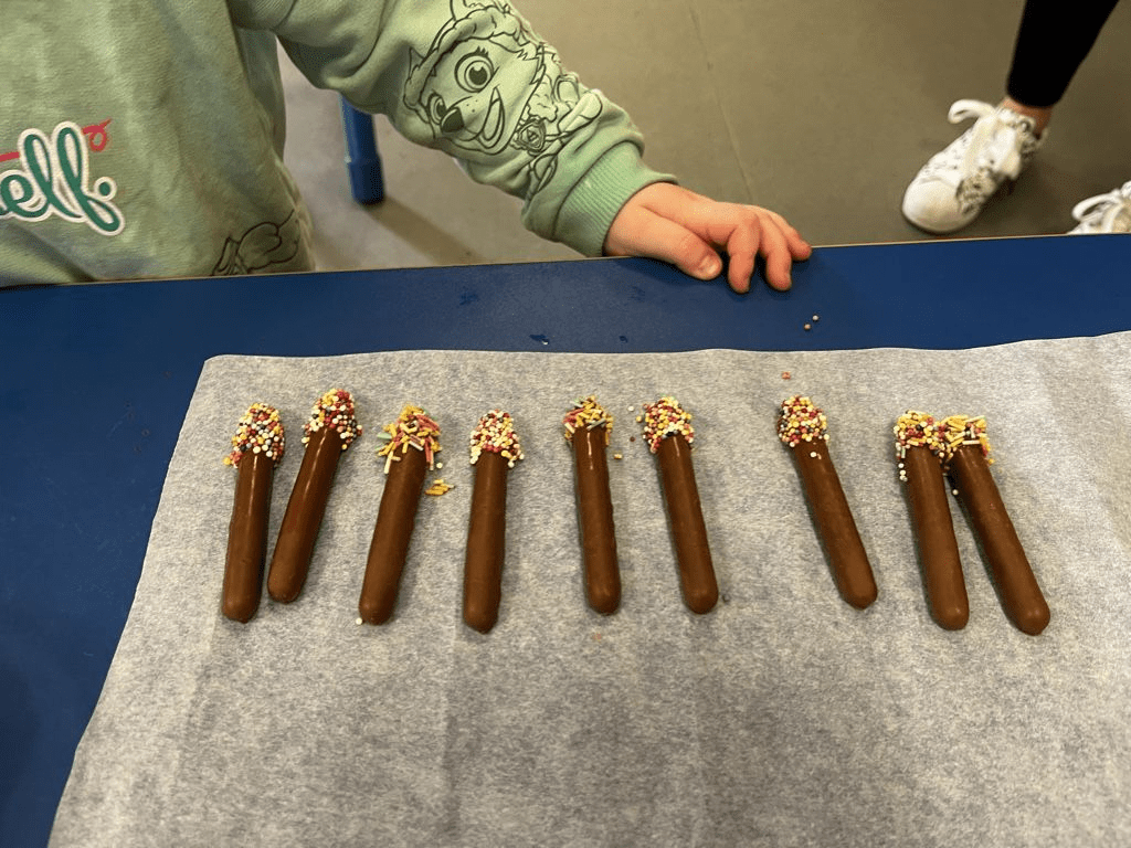 To celebrate bonfire night we had our own bonfire down at the woods and cooked some tasty hot dogs for snack. We discussed the dangers of fire and how to keep ourselves safe. “Don’t stand too close!” “If you touch the fire you will get burned.” – After our hot dogs we ate our yummy chocolate sparklers …
