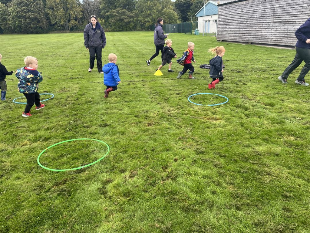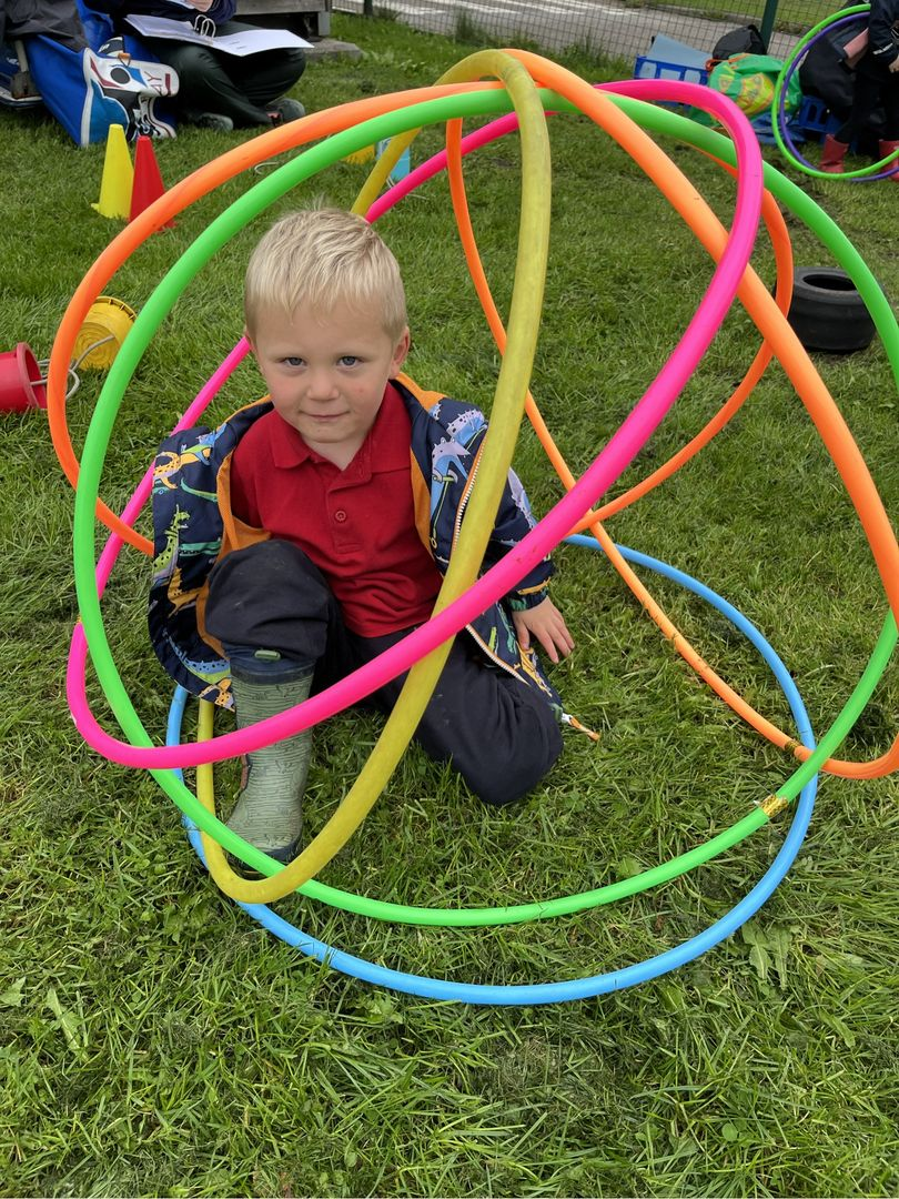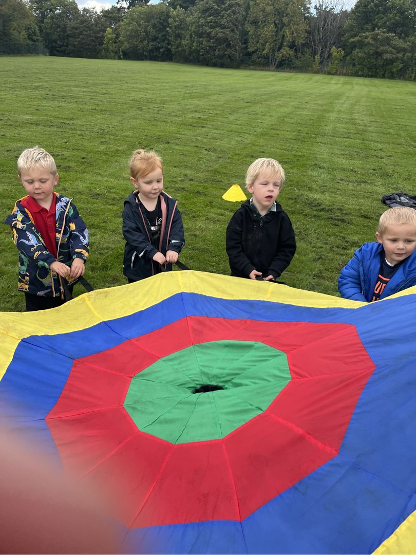 We played games; active beans, colour hoops and really enjoyed the tiny parachute. We then had time for free play. We enjoyed making dens with the hoops, practicing our balance on stilts and throwing and catching tennis balls.